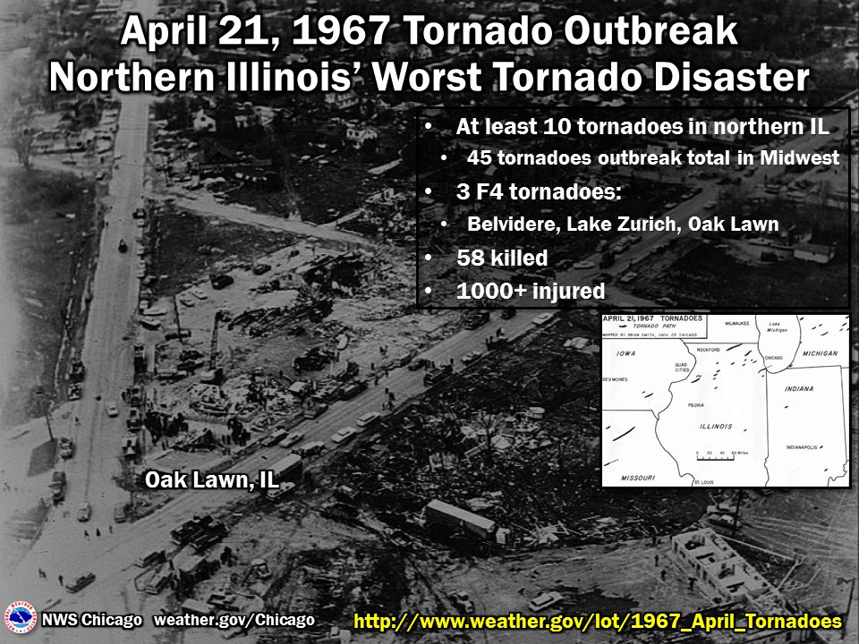 On april 21, 1967, a violent ef4 tornado, one of 10 tornadoes to whip across northern illinois that afternoon, barreled into oak lawn, leaving a path of death and destruction 200 yards wide and 16.